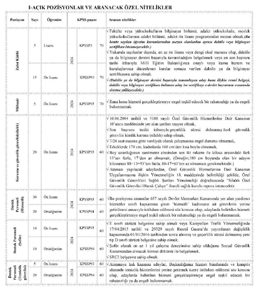 Alımlar, Kamu Personel Seçme Sınavı (KPSS) puan üstünlüğüne göre yapılacak. İlan edilen her kadro için, KPSS puanı en yüksek olan adaylar arasından 10 katı kadar aday mülakata davet edilecek.