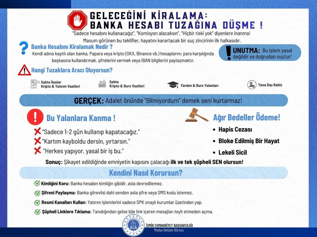 Günümüzde ağır cezai yaptırımlarla sonuçlanan ve dijital dolandırıcılık yöntemleri arasında sıkça karşılaşılan “İBAN numarası kiralama” vakalarına karşı, İzmir Cumhuriyet Başsavcılığı koordinesinde, İzmir Adliyesi Şehit Fethi Sekin Konferans Salonunda farkındalık çalışması gerçekleştirildi. Read More