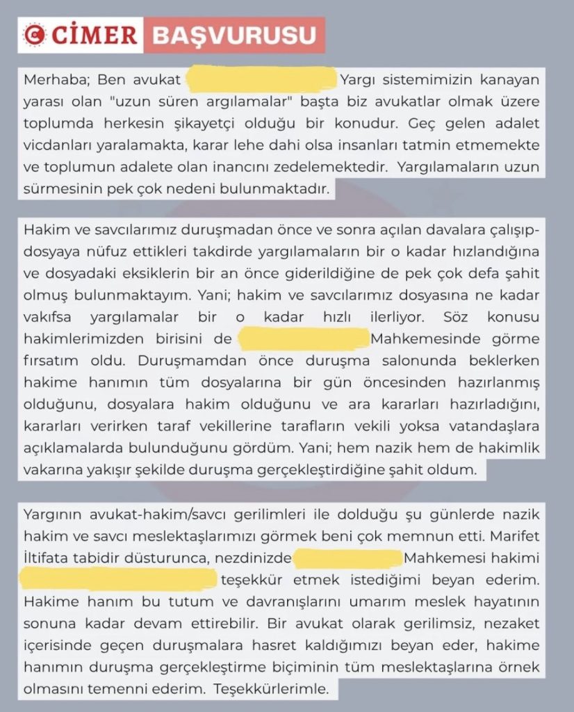 Bir avukat tarafından CİMER’e yapılan başvuruda, geciken adaletin yalnızca bireyleri değil, aynı zamanda toplumun adalet duygusunu da zedelediği vurgulandı.
